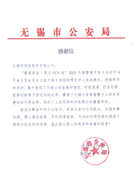 熱情服務(wù),彰顯擔(dān)當(dāng) ——公司獲無錫市公安局感謝信